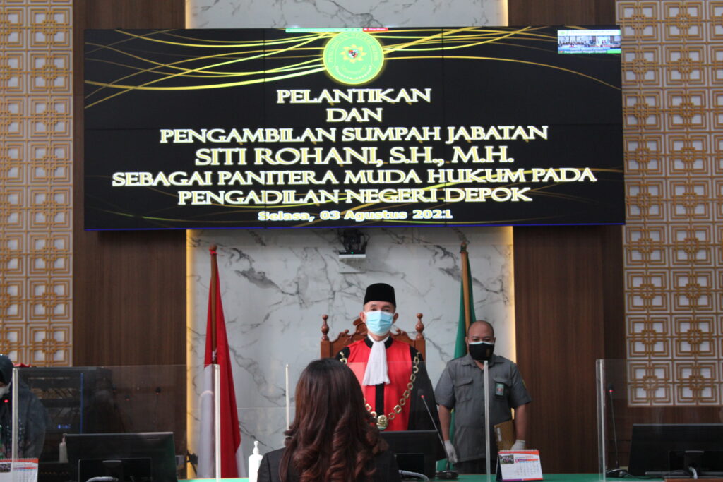 Pelantikan dan Pengambilan Sumpah Jabatan Panitera Muda hukum Pengadilan Negeri Depok, Ibu Siti Rohani, SH., MH pada hari Selasa 03 Agustus 2021 yang dipimpin langsung oleh Ketua Pengadilan Negeri Depok Bapak Syamsul Arief, SH., MH.