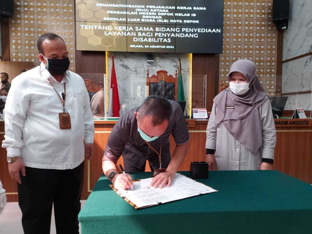 Selasa 24 Agustus 2021, bertempat diruang sidang utama Pengadilan Negeri Depok diadakan kegiatan Penandatanganan perjanjian kerjasama (MoU) antara Pengadilan Negeri Depok dengan Sekolah Luar Biasa (SLB) Negeri Kota Depok. Kegiatan ini bertujuan untuk penyediaan layanan bagi penyandang disabilitas berupa pendampingan, pelatihan dan juru bahasa isyarat. Diharapkan dengan kegiatan kerjasama ini Pengadilan Negeri Depok dapat memberikan layanan prima bagi masyarakat khusus nya penyandang Disabilitas.