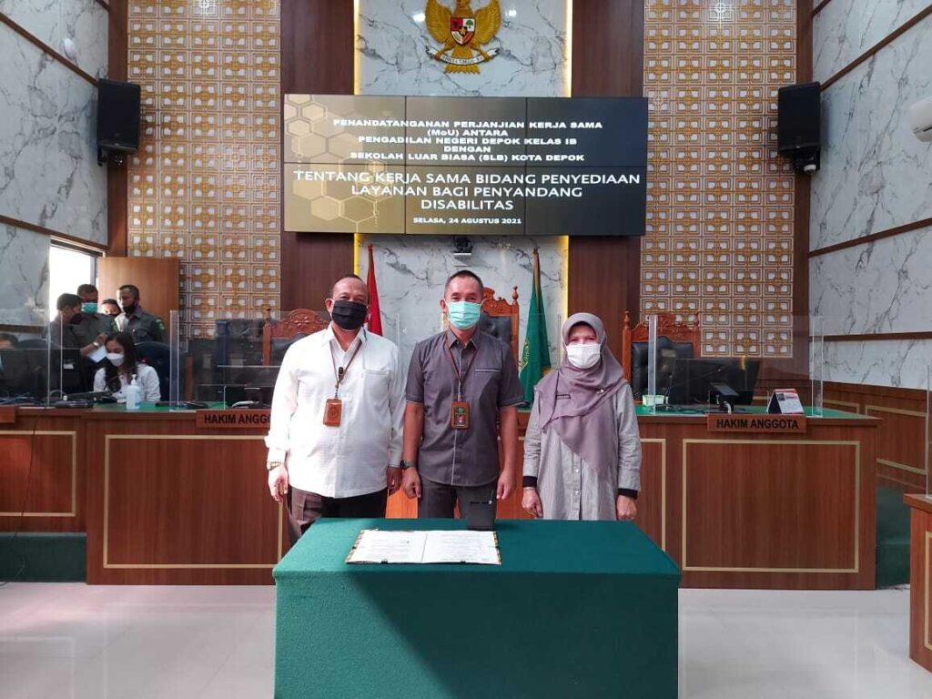 Selasa 24 Agustus 2021, bertempat diruang sidang utama Pengadilan Negeri Depok diadakan kegiatan Penandatanganan perjanjian kerjasama (MoU) antara Pengadilan Negeri Depok dengan Sekolah Luar Biasa (SLB) Negeri Kota Depok. Kegiatan ini bertujuan untuk penyediaan layanan bagi penyandang disabilitas berupa pendampingan, pelatihan dan juru bahasa isyarat. Diharapkan dengan kegiatan kerjasama ini Pengadilan Negeri Depok dapat memberikan layanan prima bagi masyarakat khusus nya penyandang Disabilitas.